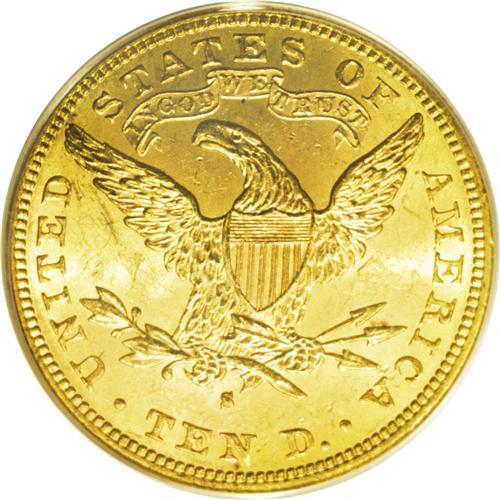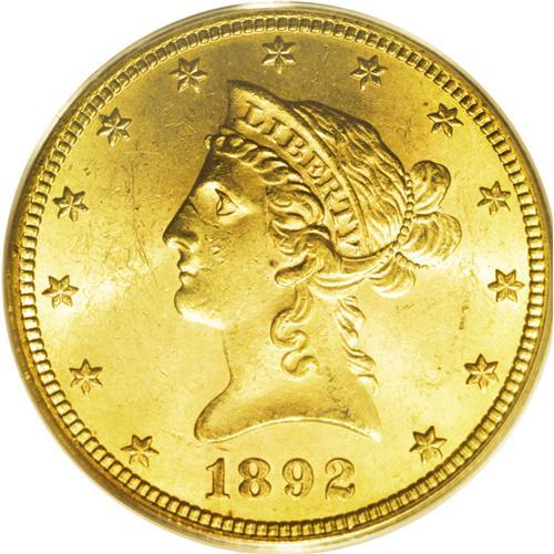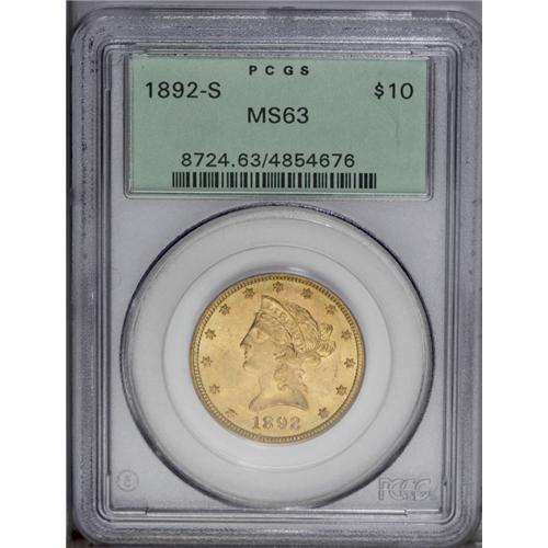 <B>1892-S<$10> MS63 PCGS.</B></I> This original and lustrous piece has rich orange and lime toning. A tick on the nose and a thin mark beneath the left (facing) wing are all that limit the grade. The 1892-S is scarce in any condition, and emerges as a bona fide rarity at the MS63 level. Housed in a green label holder. Population: 33 in 63, 0 finer (9/06).<BR><I>From The Tide Collection.</B></I>