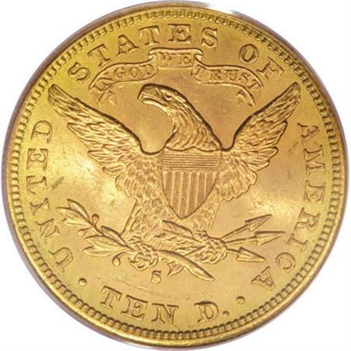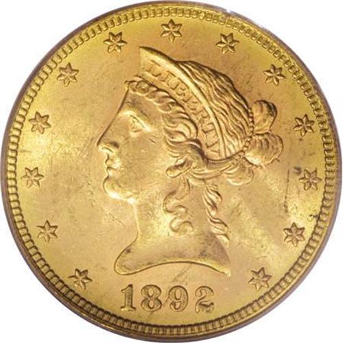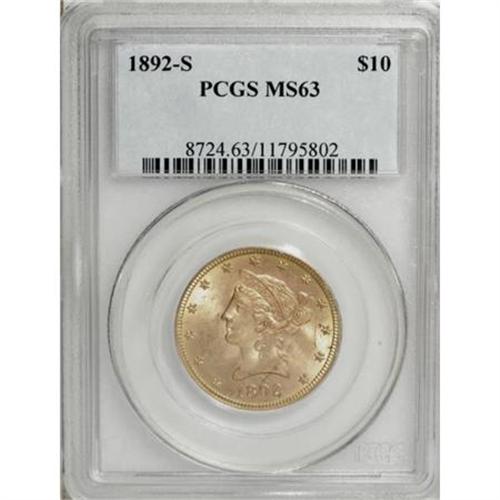 <B>1892-S $10 MS63 PCGS.</B></I> During the 1890s, gold production at the San Francisco mint favored the double eagle denomination at the expense of the half eagle and eagle. This issue's mintage of 115,500 pieces is not particularly noteworthy among the smaller S-mint ten dollar pieces, but high demand meant that virtually all would enter circulation. Those that did survive in Mint State are most often heavily abraded and grade MS62 at best. This satiny representative is not without scattered surface marks, but is clearly a notch above what is normally located. Population: 39 in 63, 0 finer (6/07).<BR><BR><B>Coin Engraver:</B> Christian Gobrecht<BR><BR><b>Shipping:</b> Coins & Currency (<a target="_blank" href="http://www.heritageauctions.com/common/shipping.php">view shipping information</a>\)