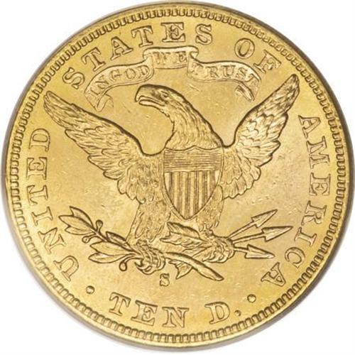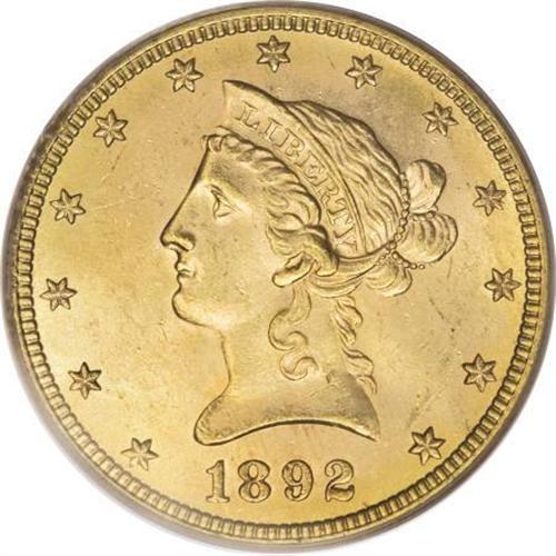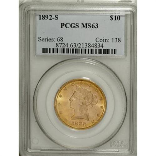<B>1892-S $10 MS63 PCGS.</B></I> The 1892-S has a relatively low mintage of 115,500 pieces. A few hundred examples apparently ended up as bank reserves, where they remained in Mint State but suffered from indifferent storage. PCGS has yet to grade any above MS63 (11/07). This lustrous lemon-gold Select eagle is sharply struck and has surprisingly few marks. A prize for the knowledgeable gold specialist.<BR><I>From The Parker Lee III Collection.</B></I><BR><BR><B>Coin Engraver:</B> Christian Gobrecht<BR><BR><b>Shipping:</b> Coins & Currency (<a target="_blank" href="http://www.heritageauctions.com/common/shipping.php">view shipping information</a>)