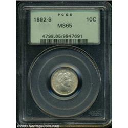 <table><tr><td><TABLE cellSpacing=0 cellPadding=0 width="100%" bgColor=#000000 border=0><TBODY> <TR><TD width="100%"><TABLE cellSpacing=1 cellPadding=3 width="100%" border=0><TBODY><TR><TD width="100%" bgColor=#79735c><FONT face=arial color=#ffffff size=3><B>Description</B> </FONT></TD></TR><TR><TD width="100%" bgColor=#ffffff><FONT face=arial size=2><B>1892-S 10C MS65 PCGS.</B></I> Among first-year Barber coinage, those issues produced at the San Francisco Mint have long been recognized as more elusive than their P and O-mint counterparts. The 1892-S dime reports an original mintage of fewer than 1 million coins (990,710). Both sides are sharply defined and pale olive-gray in color, but the dappled apricot patina that is sprinkled over the obverse is absent on the reverse. A spidery die crack (as struck) is seen near the lower obverse rim, and another rests along the left reverse periphery. A minimal number of tiny contact marks are evident on the satiny surfaces. Both of the major grading services together report ten coins in MS65, and only three finer (9/03). </FONT></TD></TR></TBODY></TABLE></TD></TR></TBODY></TABLE><BR><A name=PricesRealized></A><TABLE cellSpacing=0 cellPadding=0 width="100%" bgColor=#000000 border=0><TBODY><TR><TD width="100%"><TABLE cellSpacing=1 cellPadding=3 width="100%" border=0><TBODY><TR><TD width="100%" bgColor=#79735c><A name=PR><FONT face=arial color=#ffffff size=3><B>Previous Prices from Heritage Auctions</B> </FONT></A></TD></TR><TR><TD bgColor=#f6f6ed><TABLE cellSpacing=0 cellPadding=0 width="100%" border=1><TBODY><TR><TD align=middle width="33%"><B>Date</B></TD><TD align=middle width="33%"><B>Service</B></TD><TD align=middle width="33%"><B>Price</B></TD></TR><TR bgColor=whitesmoke><TD width="33%"><B>06/10/2000</B></TD><TD width="33%">NGC</TD><TD width="33%">$1,437.50</TD></TR><TR bgColor=whitesmoke><TD width="33%"><B>01/10/1998</B></TD><TD width="33%">NGC</TD><TD width="33%">$1,840.00</TD></TR><TR bgColor=whitesmoke><TD width="33%"><B>01/01/1999</B></TD><TD width="33%">PCGS</TD><TD width="33%">$2,300.00</TD></TR></TBODY></TABLE></TD></TR><TR><TD bgColor=#ffffff><FONT face=arial size=1 ?>PLEASE NOTE: All prices realized reflect the final hammer price PLUS the buyer's premium in auctions that charge a buyer's premium. Each item has a notation at the top of the listing indicating whether that lot included a buyer's premium. Example: A item that sells with a final hammer price of $100 and a 20% buyer's premium will display with a price realized of $120. All information listed is intended to be as accurate as possible, but errors are possible. Please use this guide carefully and inform us of any inaccuracies. </FONT></TD></TR></TBODY></TABLE></TD></TR></TBODY></TABLE><BR><TABLE cellSpacing=0 cellPadding=0 width="100%" bgColor=#000000 border=0><TBODY><TR><TD width="100%"><TABLE cellSpacing=1 cellPadding=3 width="100%" border=0><TBODY><TR><TD width="100%" bgColor=#79735c colSpan=6><FONT face=arial color=#ffffff size=3><B>Price Guide*</B> </FONT></TD></TR><TR bgColor=#f6f6ed><TD align=middle><B>Grade</B> </TD><TD align=middle><B>Coin World<BR>(Trends)</B> </TD><TD align=middle><B>Numismedia<BR>Retail</B> </TD><TD align=middle><B>Numismedia<BR>Wholesale</B> </TD><TD align=middle><B>Coin<BR>Universe</B> </TD><TD align=middle><B>Heritage<BR>Value Index</B> </TD></TR><TR bgColor=#ffffff><TD align=middle>64</TD><TD align=right>$1,550.00</TD><TD align=right>---</TD><TD align=right>$1,250.00</TD><TD align=right>$1,850.00</TD><TD align=right>$1,323.75</TD></TR><TR style="FONT-WEIGHT: bold" bgColor=#cccfdd><TD align=middle>65</TD><TD align=right>$2,300.00</TD><TD align=right>---</TD><TD align=right>$2,475.00</TD><TD align=right>$3,750.00</TD><TD align=right>$2,236.67</TD></TR><TR bgColor=#ffffff><TD align=middle>66</TD><TD align=right>$3,500.00</TD><TD align=right>---</TD><TD align=right>---</TD><TD align=right>---</TD><TD align=right>$2,892.50</TD></TR><TR bgColor=#ffffff><TD colSpan=6><FONT size=1>*All information listed is intended to be as accurate as possible, but errors are possible. No item may be returned or refused based on this information which is provided as a service to our customers. You should contact each pricing source directly to determine the accuracy of this information. </FONT></TD></TR></TBODY></TABLE></TD></TR></TBODY></TABLE><BR><TABLE cellSpacing=0 cellPadding=0 width="100%" bgColor=#000000 border=0><TBODY><TR><TD width="100%"><TABLE cellSpacing=1 cellPadding=3 width="100%" border=0><TBODY><TR><TD width="100%" bgColor=#79735c><FONT face=arial color=#ffffff size=3><B>Population Guide</B> </FONT></TD></TR><TR bgColor=#ffffff><TD align=middle><!-- Begin Output of Population Grid--><TABLE cellSpacing=0 cellPadding=0 width="100%" border=0><TBODY><TR><TD vAlign=center><TABLE cellSpacing=0 width="100%" border=1 cellsadding="3"><TBODY><TR><TD vAlign=center><TABLE cellSpacing=0 cellPadding=3 width="100%" border=1><TBODY><TR><TD vAlign=center align=middle bgColor=#f0f1e8 colSpan=2 <CENTER><FONT face=Arial size=2><B>PCGS Pop </B></FONT><CENTER></CENTER></TD><TD vAlign=center align=middle bgColor=#f0f1e8 colSpan=2><CENTER><FONT face=Arial size=2><B>NGC Pop</B></CENTER></FONT></TD></TR><TR><TD vAlign=center><FONT face=Arial size=2>(65)</FONT> </TD><TD vAlign=center align=right><FONT face=Arial size=2>7</FONT> </TD><TD vAlign=center><FONT face=Arial size=2>(65)</FONT> </TD><TD vAlign=center align=right><FONT face=Arial size=2>3</FONT> </TD></TR><TR><TD vAlign=center><FONT face=Arial size=2>(>65)</FONT> </TD><TD vAlign=center align=right><FONT face=Arial size=2>0</FONT> </TD><TD vAlign=center><FONT face=Arial size=2>(>65)</FONT> </TD><TD vAlign=center align=right><FONT face=Arial size=2>3</FONT> </TD></TR></TBODY></TABLE></TD></TR></TBODY></TABLE></TD></TR></TBODY></TABLE><!-- End Output of Population Grid--></TD></TR></TBODY></TABLE></TD></TR></TBODY></TABLE><BR><TABLE cellSpacing=0 cellPadding=0 width="100%" bgColor=#000000 border=0><TBODY><TR> Important no