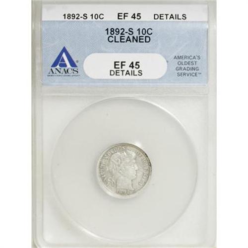 <B>1892-S 10C --Cleaned--ANACS. XF45 Details.</B></I> NGC Census: (1/61). PCGS Population (3/105). Mintage: 990,710. Numismedia Wsl. Price for NGC/PCGS coin in XF45: $249. (#4798)<BR><BR><B>Coin Engraver:</B> Charles E. Barber<BR><BR><b>Shipping:</b> Coins & Currency (<a target="_blank" href="http://www.heritageauctions.com/common/shipping.php">view shipping information</a>)
