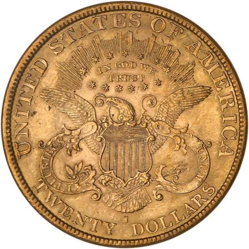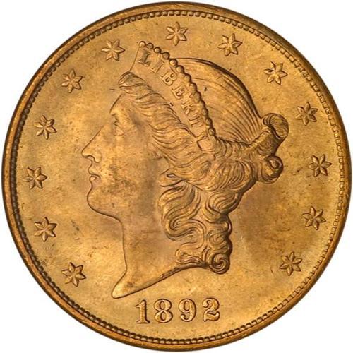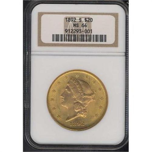 <b>1892-S $20 Liberty. NGC graded MS64.</b> A boldly original pale pinkish-gold surfaced coin whose high-end depth of detail in the design complements the equally fresh Mint State 64 bloom. Where an ineffectual imprint is often left by the rebound of the dies that struck this year's coinage, the opposite is in fact the case here: devices show crystal clarity and abnormally crisp detail in the centers. Bidders be warned, you may face stiff competition since NGC has graded only 44, with 3 higher <b>(PCGS # 9021)</b> <i>