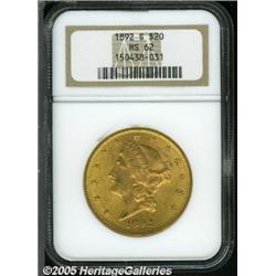 <B>1892-S $20 MS62 NGC.</B></I> Adequately struck, with apricot-gold surfaces and soft luster. Small contact marks are evident on Liberty's cheek and neck.