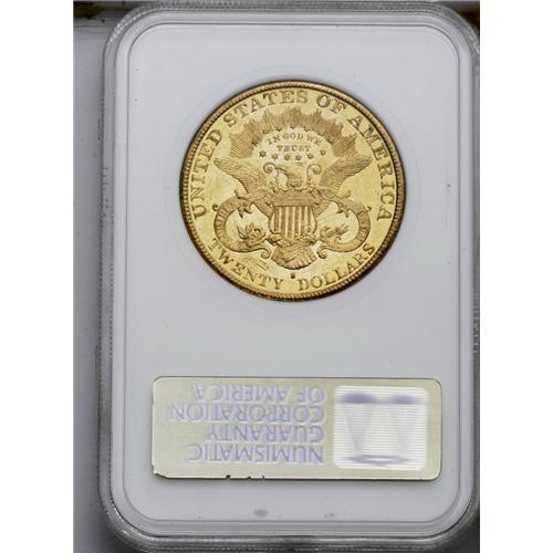 <B>1892-S<$20> MS62 NGC.</B></I> An attractive semi-prooflike Type Three twenty. The apricot-tinted surfaces are only lightly abraded save for moderate marks above TWENTY and near the jaw. Certified in a prior generation NGC holder.