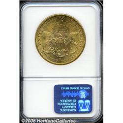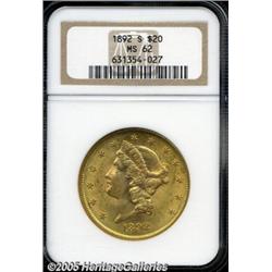 <B>1892-S $20 MS62 NGC.</B></I> The blazing luster provides lemon-gold and olive colors. Sharply impressed, the central obverse is typically marked while the fields are nicely preserved.