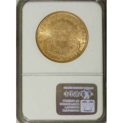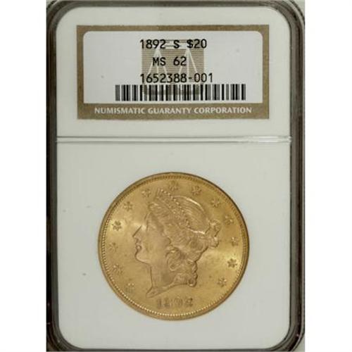 <B>1892-S $20 MS62 NGC.</B></I> NGC Census: (1168/350). PCGS Population (952/503). Mintage: 930,150. Numismedia Wsl. Price for NGC/PCGS coin in MS62: $785. (#9021)<BR><BR><B>Coin Engraver:</B> James B. Longacre<BR><BR><b>Shipping:</b> Coins & Currency (<a target="_blank" href="http://www.heritageauctions.com/common/shipping.php">view shipping information</a>\)