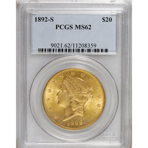 1892-S $20 MS62 PCGS. Solidly struck with strong, plea