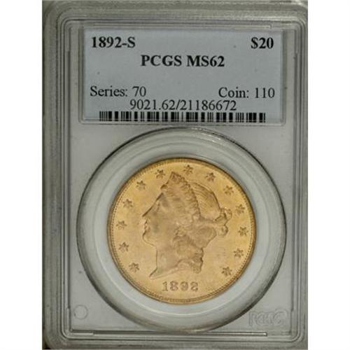 <B>1892-S $20 MS62 PCGS.</B></I> PCGS Population (1008/529). NGC Census: (1175/354). Mintage: 930,150. Numismedia Wsl. Price for NGC/PCGS coin in MS62: $785. (#9021)<BR><BR><B>Coin Engraver:</B> James B. Longacre<BR><BR><b>Shipping:</b> Coins & Currency (<a target="_blank" href="http://www.heritageauctions.com/common/shipping.php">view shipping information</a>)