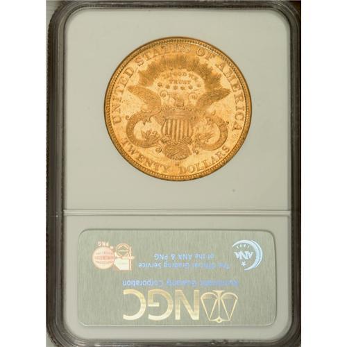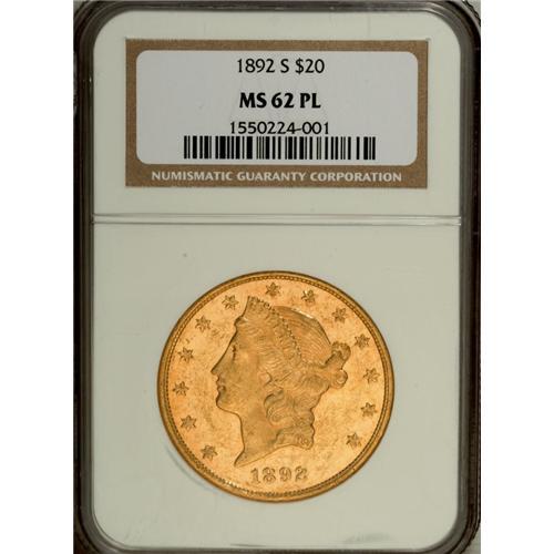 <B>1892-S $20 MS62 Prooflike NGC.</B></I> Extremely prooflike surfaces accentuate the bagmarks especially in the fields, but despite these distractions, the deeply mirrored elements of this coin clearly overshadow its imperfections.<BR><BR><b>Shipping:</b> Coin/Currency (<a target="_blank" href="http://www.heritageauctions.com/common/shipping.php">view shipping information</a>)
