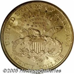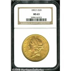 <B>1892-S $20 MS63 NGC.</B></I> An extremely important opportunity for the advanced collector to acquire this issue in a pleasing quality. This is a condition rarity, and few finer examples survive. It has frosty yellow-gold color with highly lustrous and brilliant surfaces.<BR><I>From The Richard J. Chouinard Collection of United States Coins, Part Three. Ex: Stack's (10/91), lot 2246.</B></I>