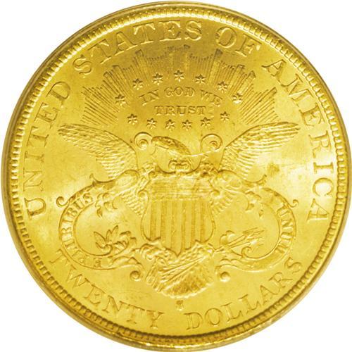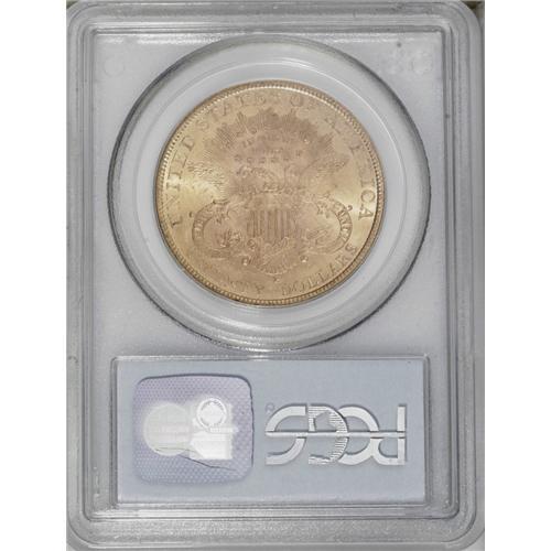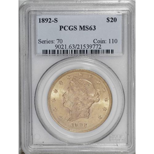 <B>1892-S<$20> MS63 PCGS.</B></I> A fully lustrous and lightly abraded double eagle. Green-gold highpoints grace the devices, while the fields are honey-yellow. The mintmark is filled, but the strike is otherwise crisp. Uncirculated 1892-S double eagles are plentiful, but are typically found with heavy marks. Relatively smooth pieces continue to attract large premiums.
