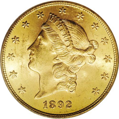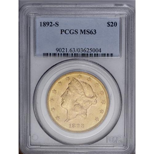 <B>1892-S $20 MS63 PCGS.</B></I> A satiny Mint State coin that has the usual strong strike but finer than average surfaces. Clean on Liberty's cheek and neck, and difficult to obtain finer than offered here.