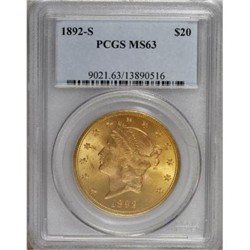 <B>1892-S $20 MS63 PCGS.</B></I> Many 1892-S double eagles, along with other San Francisco twenty dollar issues of the era, were shipped to Europe or South America for international trade (Jeff Garrett and Ron Guth, 2006), making this date readily available in all but the highest Mint State grades. This Select example exhibits yellow-gold color with a faint green cast, and pleasing luster. A sharp strike emboldens the design features. A few obverse contact marks and scuffs limit the grade.<BR><BR><b>Shipping:</b> Coins & Currency (<a target="_blank" href="http://www.heritageauctions.com/common/shipping.php">view shipping information</a>)