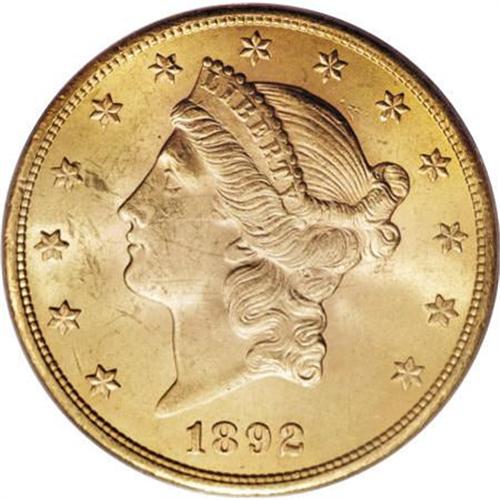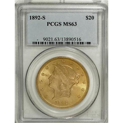 <B>1892-S $20 MS63 PCGS.</B></I> Many 1892-S double eagles, along with other San Francisco twenty dollar issues of the era, were shipped to Europe or South America for international trade (Jeff Garrett and Ron Guth, 2006), making this date readily available in all but the highest Mint State grades. This Select example exhibits elegant yellow-gold color with a faint green cast, and pleasing luster. A sharp strike emboldens the design features. A few faint abrasions on the obverse account for the grade.<BR><BR><B>Coin Engraver:</B> James B. Longacre<BR><BR><b>Shipping:</b> Coins & Currency (<a target="_blank" href="http://www.heritageauctions.com/common/shipping.php">view shipping information</a>)