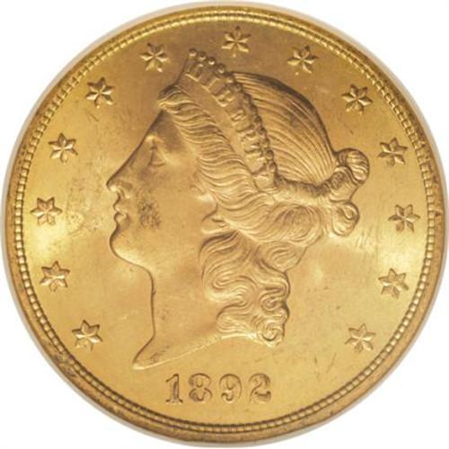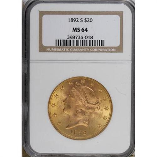 <B>1892-S $20 MS64 NGC.</B></I> A couple of small groups of 1892-S twenties entered the marketplace in the early 1990s, which account for many of the better-grade examples known today of this issue. This is a particularly attractive coin that displays rich pinkish-gold and lilac coloration. Sharply struck with a few small field marks, especially on the reverse, and light abrasions on the cheek of Liberty. Census: 46 in 64, 4 finer (5/07).<BR><BR><b>Shipping:</b> Coins & Currency (<a target="_blank" href="http://www.heritageauctions.com/common/shipping.php">view shipping information</a>)