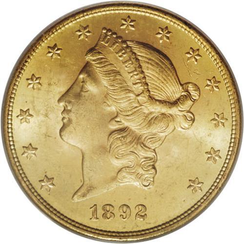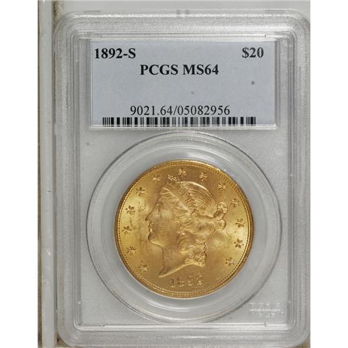 <B>1892-S $20 MS64 PCGS.</B></I> 1892-S double eagles are easily found in grades from AU to MS63. Near-Gems are more difficult, as attested to by the slightly more than 100 certified examples, and full Gem and finer pieces are quite rare. This MS64 specimen displays lustrous apricot-gold surfaces and sharply struck design features. A couple of minor obverse rim marks, and some minute abrasions on Liberty's cheek, limit the grade. Population: 67 in 64, 1 finer (4/07).<BR><BR><b>Shipping:</b> Coins & Currency (<a target="_blank" href="http://www.heritageauctions.com/common/shipping.php">view shipping information</a>)