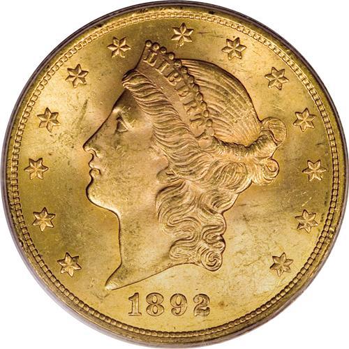 <B>1892-S $20 MS64 PCGS.</B></I> A boldly struck coin that displays a soft, frosted sheen and delicate orange and lilac highlights. The satiny fields are only sparsely abraded, none of which are particularly deep or distracting. Virtually unsurpassable quality for this otherwise obtainable S-mint twenty. Population: 67 in 64, 1 finer (3/07).<BR><BR><b>Shipping:</b> Coins & Currency (<a target="_blank" href="http://www.heritageauctions.com/common/shipping.php">view shipping information</a>)