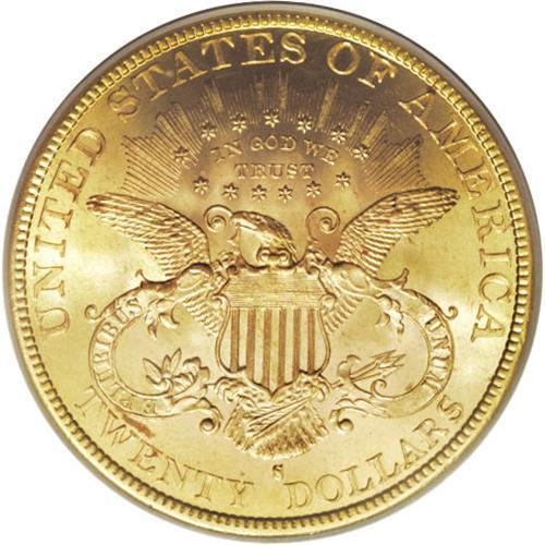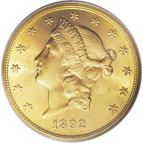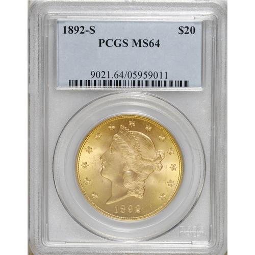 <B>1892-S $20 MS64 PCGS.</B></I> An enticing near-Gem representative of this later Type Three double eagle, one that is the numeric equivalent of the finest examples of this issue ever offered by Heritage, a roster that includes the Kutasi specimen. The obverse has shimmering, satiny surfaces, while the apricot-gold reverse is more flashy. Well-defined with a handful of grade-defining scrapes and grazes on Liberty's neck and in the nearby fields. NGC has awarded Gem or better grades to just four pieces, and PCGS has certified only one coin finer (2/07).<BR><BR><b>Shipping:</b> Coins & Currency (<a target="_blank" href="http://www.heritageauctions.com/common/shipping.php">view shipping information</a>)