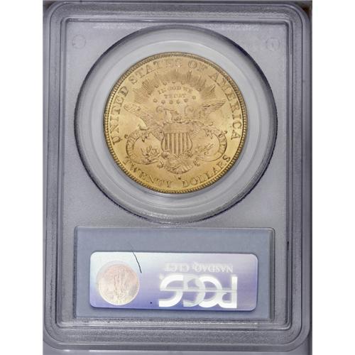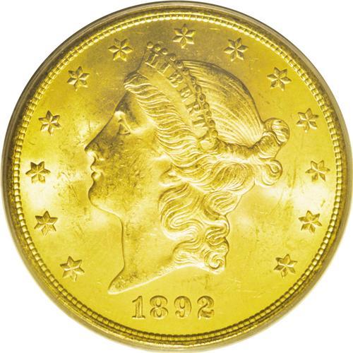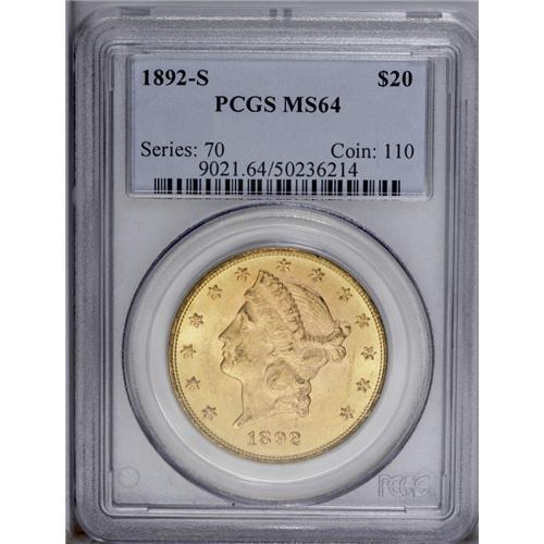 <B>1892-S<$20> MS64 PCGS.</B></I> An uncommonly clean coin for the issue, both sides are free of all but a few trivial abrasions. The powerful striking pressure draws forth every last design element. Lime-gold in color, the surfaces exhibit a richly frosted finish. Both major grading services combined report only three examples above the present level (7/06).