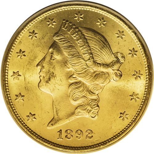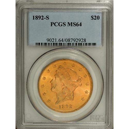 <B>1892-S $20 MS64 PCGS.</B></I> Breen-7312. This appears to be Breen's "1892/1-S" variety, although the raised elements within the 2 may simply represent a defective punch. This boldly impressed near-Gem offers scintillating luster and attractive preservation. The ideal candidate for a competitive Registry Set. Population: 69 in 64, 0 finer (11/06).<BR><BR><b>Shipping:</b> Coin/Currency (<a target="_blank" href="http://www.heritageauctions.com/common/shipping.php">view shipping information</a>)