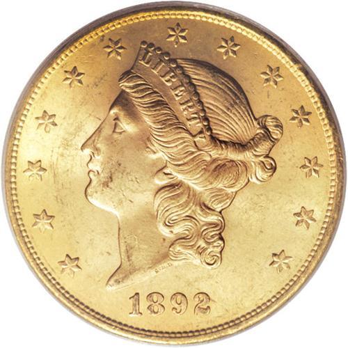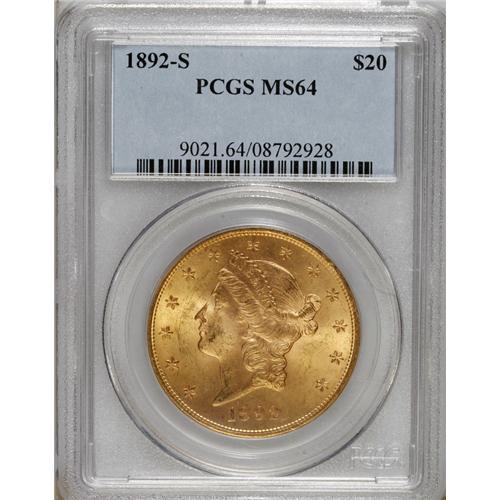 <B>1892-S $20 MS64 PCGS.</B></I> Breen-7312. This appears to be Breen's "1892/1-S" variety, although the raised elements within the 2 may simply represent a defective punch. This boldly impressed near-Gem offers scintillating luster and attractive preservation. The 1892-S double eagle is considered a common coin and finding an example in circulated or low-Mint State grades is easily accomplished. However, the PCGS <I>Population Report</B></I> provides a startling insight into the true condition scarcity of 1892-S twenties. A mere 67 have been graded at the MS64 level, with only one graded higher; a sole MS65 (4/07). International trade is to blame for this fact, as most S-mint double eagles of this era were shipped abroad shortly after being struck. The current example provides a scarce opportunity to acquire an 1892-S twenty in the upper echelon of extant pieces, in terms of technical grade.<BR><BR><b>Shipping:</b> Coins & Currency (<a target="_blank" href="http://www.heritageauctions.com/common/shipping.php">view shipping information</a>)
