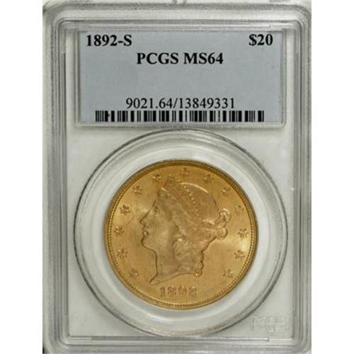 <B>1892-S $20 MS64 PCGS.</B></I> This issue is common at AU and Mint State grades up to and including MS63. Near-Gems are scarce, and examples certified finer than MS64 are excessively rare. This Choice Uncirculated example displays lovely peach-gold toning and impressive shimmering luster across both sides. A few wispy marks occur on obverse and reverse alike, but these are non-distracting and certainly not excessive for the grade. <BR><BR><B>Coin Engraver:</B> James B. Longacre<BR><BR><b>Shipping:</b> Coins & Currency (<a target="_blank" href="http://www.heritageauctions.com/common/shipping.php">view shipping information</a>\)