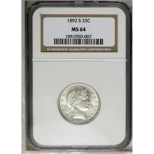 <B>1892-S<25C> MS64 NGC.</B></I> Type Two Reverse. A charming and subtly lustrous near-Gem, virtually untoned and nicely struck. A few tiny marks are noted in the obverse fields. Census: 18 in 64, 10 finer (7/06).