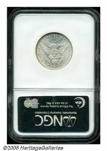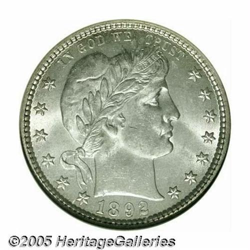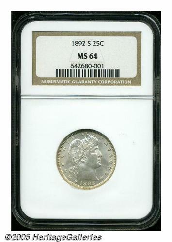 <B>1892-S<25C> MS64 NGC.</B></I> Type One Reverse. A nearly brilliant and highly lustrous near-Gem that is well struck and void of detrimental marks. Light die doubling is noted on the reverse legends. First year type coins have a reputation for being set aside by the curious, however, the 1892-S is very scarce in Mint State. Population: 18 in 64, 7 finer (4/05).