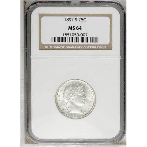 <B>1892-S 25C MS64 NGC.</B></I> Type Two Reverse. A thoroughly lustrous near-Gem, virtually untoned and decisively struck. Faint marks above the jaw will be missed by most. Census: 18 in 64, 10 finer (12/06).<BR><BR><b>Shipping:</b> Coins & Currency (<a target="_blank" href="http://www.heritageauctions.com/common/shipping.php">view shipping information</a>)