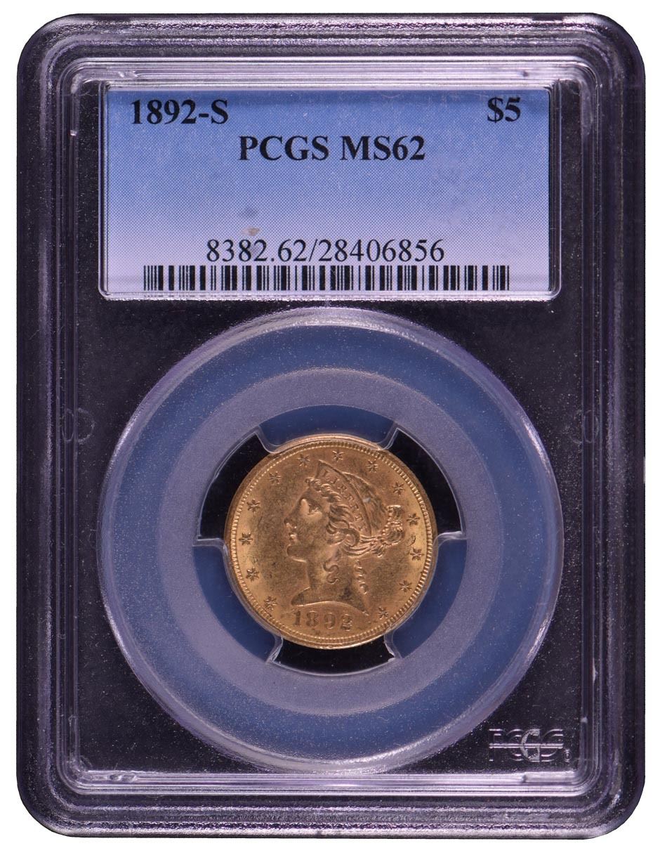 One 1892-S $5 Liberty Head Half Eagle Gold Coin PCGS MS62.