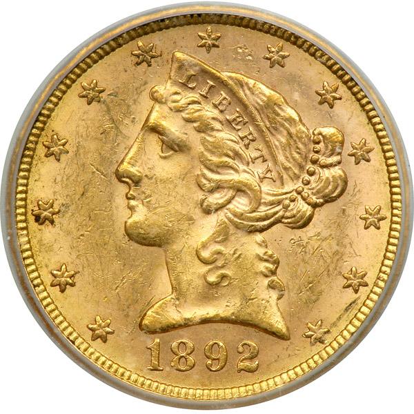 1892-S $5 Liberty. ICG graded MS-63. Toned.