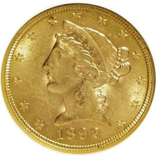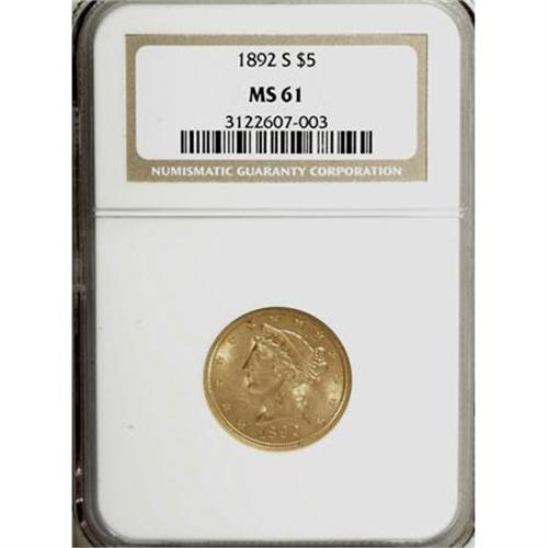 <B>1892-S $5 MS61 NGC.</B></I> NGC Census: (78/62). PCGS Population (29/77). Mintage: 298,400. Numismedia Wsl. Price for NGC/PCGS coin in MS61: $585. (#8382)<BR><BR><B>Coin Engraver:</B> Christian Gobrecht<BR><BR><b>Shipping:</b> Coins & Currency (<a target="_blank" href="http://www.heritageauctions.com/common/shipping.php">view shipping information</a>)
