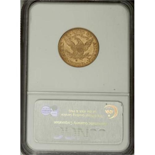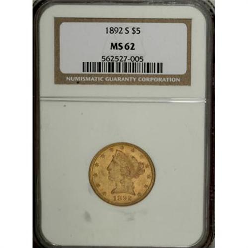 <B>1892-S $5 MS62 NGC.</B></I> Sharply detailed with scattered surface marks on each side, as expected for the grade.<BR><BR><B>Coin Engraver:</B> Christian Gobrecht<BR><BR><b>Shipping:</b> Coins & Currency (<a target="_blank" href="http://www.heritageauctions.com/common/shipping.php">view shipping information</a>)