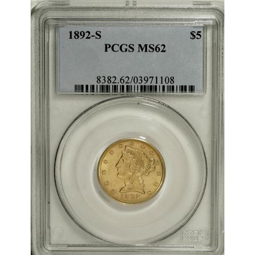 <B>1892-S $5 MS62 PCGS.</B></I> This sharply impressed better date Motto five has reasonable luster and few marks. The reverse is particularly attractive. Population: 47 in 62, 25 finer (2/07).<BR><BR><b>Shipping:</b> Coins & Currency (<a target="_blank" href="http://www.heritageauctions.com/common/shipping.php">view shipping information</a>)