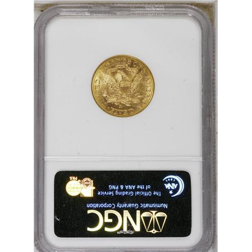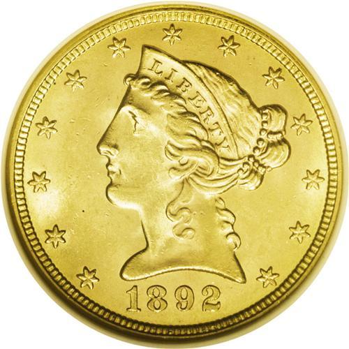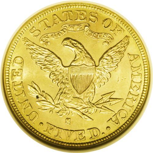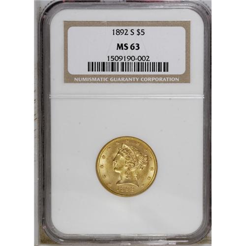 <B>1892-S<$5> MS63 NGC.</B></I> It is worthwhile to remember that the 1892-S half eagle is an elusive issue that was produced at a time when few, if any, collectors aside from the legendary John M. Clapp had an interest in mintmarked coins. It was the following year, 1893, when Augustus G. Heaton published <I>A Treatise on Coinage of the United States Branch Mints,</B></I> listing "causes of attractiveness" of various mintmarked issues. The present example boasts pretty orange-gold surfaces with a few grade-consistent abrasions. A scrape on Liberty's chin is noted, and a small dark toning spot near an olive berry on the reverse. NGC has graded five coins finer (9/06).