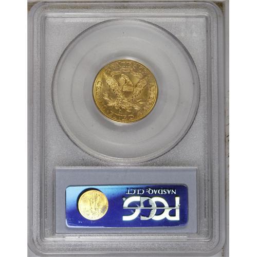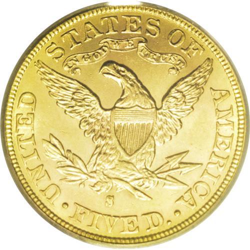 <B>1892-S<$5> MS64 PCGS.</B></I> The 1892-S is a scarce issue typically encountered in AU. Most Mint State pieces are clustered in MS61 and MS62 grades, which indicates long-term indifferent storage during the era when such coins were regarded strictly as bullion. In 1892, J.M. Clapp was perhaps the only individual seeking contemporary mintmarked gold coins in high grade. The pedigree of the present near-Gem is unknown, but its shimmering surfaces are devoid of relevant marks, and the strike is attentive. Population: 5 in 64, 0 finer (9/06).