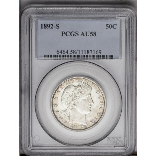 1892-S 50C AU58 PCGS. In Mint State grades, Barber coi 1892-S[50C] AU58 PCGS.