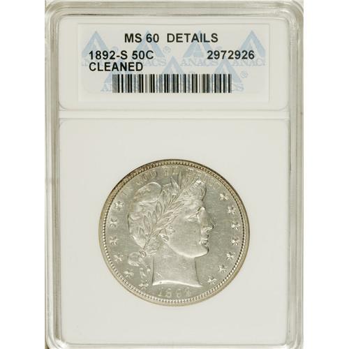 <B>1892-S 50C --Cleaned--ANACS. MS60 Details.</B></I> A nearly untoned example of this better date Barber half. Well struck and only lightly abraded, but dipping has diminished the cartwheel sheen.<BR><BR><b>Shipping:</b> Coins & Currency (<a target="_blank" href="http://www.heritageauctions.com/common/shipping.php">view shipping information</a>)