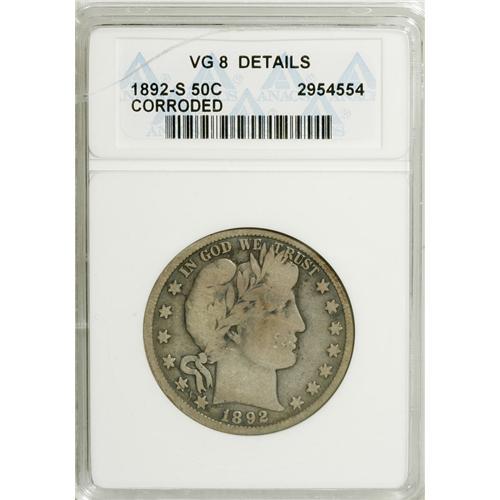 <B>1892-S 50C --Corroded--ANACS. VG8 Details.</B></I> NGC Census: (6/119). PCGS Population (2/175). Mintage: 1,029,028. Numismedia Wsl. Price: $261. (#6464)<BR><BR><b>Shipping:</b> Coins & Currency (<a target="_blank" href="http://www.heritageauctions.com/common/shipping.php">view shipping information</a>)