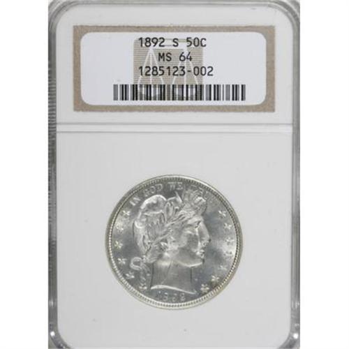 <B>1892-S 50C MS64 NGC.</B></I> This silver-white specimen appears close to a Prooflike designation, with well-mirrored fields that show some light contact evidence and thickly frosted devices, particularly on the reverse. There is no discernible color. The 1892-S is high on the want list of many collectors, and this memorable specimen should more than fill the bill. Census: 10 in 64, 10 finer (1/08).<BR><I>From The Southwest Collection.</B></I><BR><BR><B>Coin Engraver:</B> Charles E. Barber<BR><BR><b>Shipping:</b> Coins & Currency (<a target="_blank" href="http://www.heritageauctions.com/common/shipping.php">view shipping information</a>)