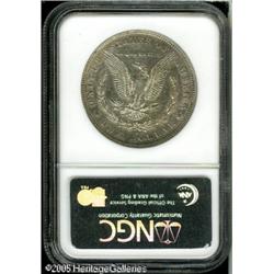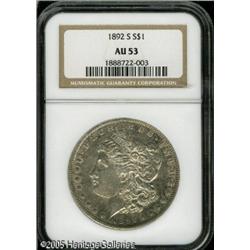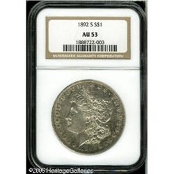 <B>1892-S<img border='0' src='http://www.heritagecoins.com/images/star.gif' width=10 height=10>$1 AU53 NGC.</B></I> A very pleasing example of this key issue. The fields still retain a substantial portion of luster and both sides show some mottled steel-gray toning. There are a few small marks present, one is mentioned from the left obverse field across Liberty's cheek. An impressive example of this much sought-after issue. Lot:10398