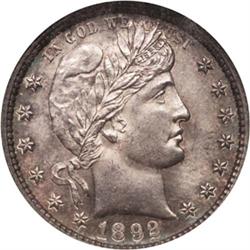 Quarter Dollars 1892-s NGC graded Mint State 65. <b>First year of issue as well as the scarcest 1892-dated Quarter, the mint having struck fewer than a million pieces. This is a classy looking Gem Brilliant Uncirculated with dazzling luster, bathed in light to medium purple gray with gold in the undertone, and struck boldly. Even the littlest detail is sharp. A handsome gem. The bill which ordered a change in the design of the silver coins, and which further authorized the Treasury Department to change any coin design after it had been in use for 25 years, passed Congress on September 26, 1890. This bill specifically called for a change in the Silver Dollar and the Nickel as soon as it could be done realistically after the act passed. Had this part of the bill been followed by the Mint, it would have ended the Morgan Dollar series in 1891 and the Liberty Nickel likewise. The Barber design itself (for the Half and Quarter Dollar) brought together some suggestions from Mint Director Leech as well as a couple of last minute modifications (particularly the removal of Barber's original clouds above the stars on the reverse -- see Judd's Pattern book for a sample of the 1891 Patterns). As finally issued, these two denominations feature six-pointed stars on the obverse, as had been used on the Seated Liberty coinage, but five-pointed ones on the reverse (which had also been Barber's original choice for the obverse). These are the only regular circulation United States coins with stars having different numbers of points on the obverse and reverse and are the first regular issue coins since the Half Disme of 1792 which use five-pointed stars.</b>   <p align="center">Superior Galleries was founded in 1929 and has been a leader in