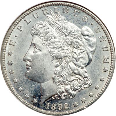 1892-S Morgan Dollar. NGC graded AU-58. Scarce date in high grade. Lustrous, tarnish-free obverse and reverse and attractive for the grade with almost abrasion-free fields. Sharp strike. There is a small diagonal mark below the eye of Liberty along with some milky toning like a thin veil over the surface. We'd be remiss if we didn't mention that the eagle is virtually untouched by bagmarks. As is well known, over 1 million of these were struck. But what seems apparent as well, nearly all '92-S dollars were either put into circulation or melted at the time of the Pittman Act (1918) (PCGS # 7218) .