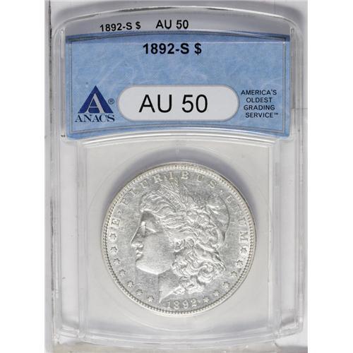 <B>1892-S<img border='0' src='http://www.heritagecoins.com/images/star.gif' width=10 height=10>$1> AU50 ANACS.</B></I> Lightly worn in a highpoint pattern with traces of the original luster. The tin-gray surfaces show solid detail in general, though they also display the expected handling marks.
