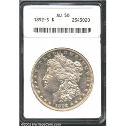 1892-S S$1 AU50 ANACS. There is a trace of rub in the centers, with the remainder of the devices sharply detailed. The cheek and obverse field are moderately abraded, but there are no individually significant blemishes. Luster connects the obverse stars and legends. A coveted issue even in upper circulated grades. Important notice: We expect to be auctioning lots at the rate of 200-250 per hour. Sometimes eBay Premier live bid software cannot keep up with that pace, so we strongly recommend that you place a realistic proxy bid now as insurance to avoid disappointment. Also please note that all Heritage/CAA lots purchased through eBay Premier carry a 20% Buyer's Premium.
