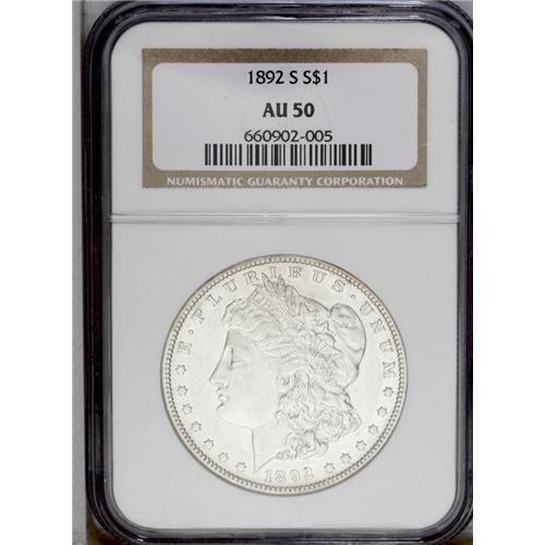 <B>1892-S<img border='0' src='http://www.heritagecoins.com/images/star.gif' width=10 height=10>$1> AU50 NGC.</B></I> An untoned key date silver dollar that has ample luster despite light wear on the forehead, the hair above the ear, and the eagle's breast. The infrequent small mark is present, but these are unimportant for the grade.