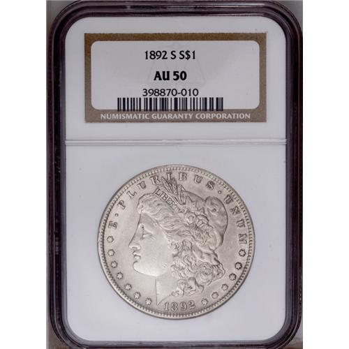 <B>1892-S<img border='0' src='http://www.heritagecoins.com/images/star.gif' width=10 height=10>$1> AU50 NGC.</B></I> Attractive light gray surfaces with some remaining luster on both sides. The surfaces are pleasing for the grade, and overall, this is a desirable example that is only occasionally seen any finer.