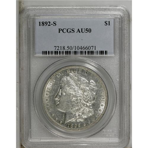 <B>1892-S<img border='0' src='http://www.heritagecoins.com/images/star.gif' width=10 height=10>$1> AU50 PCGS.</B></I> The '92-S is an important key date that becomes exceedingly scarce in Mint State. This AU example is lightly worn and untoned, with noticeable hairlines in the fields and a couple of minor milling marks on Liberty's cheek.