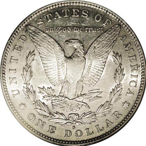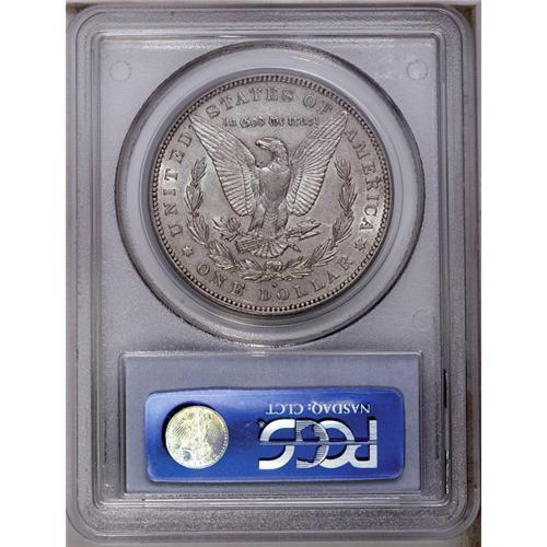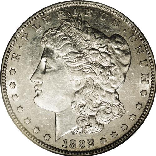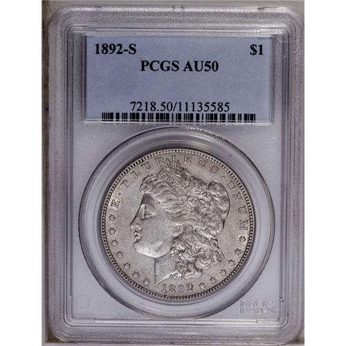 <B>1892-S<img border='0' src='http://www.heritagecoins.com/images/star.gif' width=10 height=10>$1> AU50 PCGS.</B></I> While the 1892-S dollar is scarce to rare in Mint State, AU specimens are relatively available with a little patience and searching. The silver-gray surfaces of this piece display luster in the protected areas, and an occasional wisp of barely discernible light tan color. The design elements retain nice detail, though the hair above Liberty's ear and the eagle's breast are somewhat smooth. Some wispy slide marks are noted on each side, and a mint-made planchet flaw is visible on Liberty's cheek.