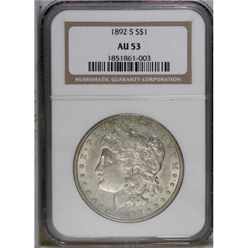 <B>1892-S<img border='0' src='http://www.heritagecoins.com/images/star.gif' width=10 height=10>$1> AU53 NGC.</B></I> A well struck example with light highpoint wear and attendant handling marks. This coin retains most of its original luster, and the reverse has slight reflectivity.